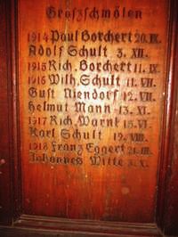 Zum Gedächtnis unserer im Weltkriege 1914-18 Gefallenen (Namen) Zum Gedenken an die Gefallenen des 2. Weltkrieges (Namen)
