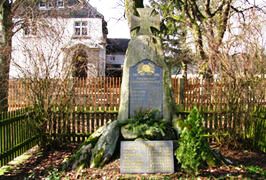 Das Naturstein-Denkmal mit krönendem Tatzenkreuz steht in einer kleinen umzäunten Anlage.