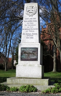 Vor der Kirche steht auf einem stufigen Unterbau eine viereckige Säule. An der Vorderseite die Widmung für den 1.Weltkrieg, an den Seitenflächen die Namen und Daten.