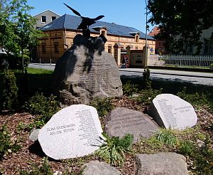 Denkmal 1. und 2. Weltkrieg, Findling mit krönendem Adler mit Namen 1. Weltkrieg, davor drei abgelegte Steinplatten mit