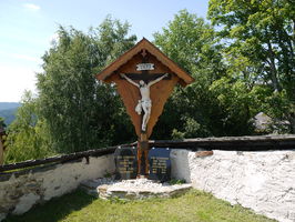 A.: Gekreuzigter und zwei Tafeln mit Genereller Inschrift (ohne Namen) in einer Ecke des Friedhofes.