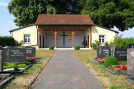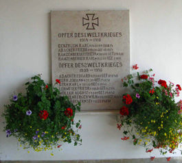 Gedenktafel für die Opfer beider Weltkriege an der Außenwand der Aussegnungshalle des Friedhofs.