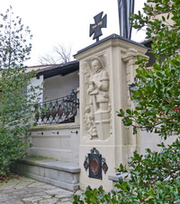 quadratische Säule mit dem Relief eines Engels in Ritterrüstung mit Schwert und Schild. Am Fuße dieser