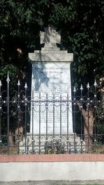 Konischer Steinsockel mit abschließendem Eisernen Kreuz auf dem Friedhof vor der Kirche.