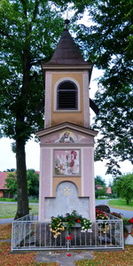 Wandplaketten auf einem Bildstock am Dorfplatz.