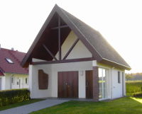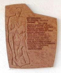 Kirche mit Friedhof: Aussegnungshalle Steinplatte mit zwei Menschen, Inschrift und den Namen der Gefallenen beider Weltkriege.