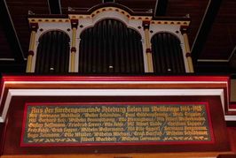 Gedenken für die Gefallenen des 1. Weltkriegs auf der Empore der Kirche, direkt unter der Orgel.