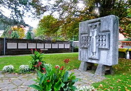 Im Zentrum einer kleinen Parkanlage am Martiniplatz steht ein quadratisches Betonteil mit Reliefs auf beiden Seiten daneben in einiger Entfernung hängen acht Wandplaketten auf einer Ziegelmauer.