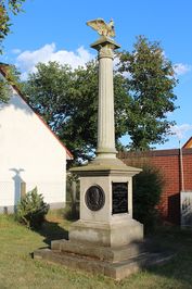 An der Hauptstraße: Gedenksäule für die Kriege 1866 und 1870 mit Adler, an zwei Seiten Profile von Wilhelm I.