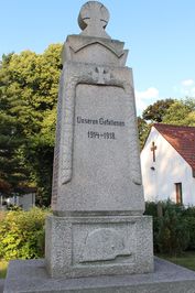 und ?, Namen auf der Rückseite; 1. Weltkrieg: Stele auf vierstufigem Podest mit Kreuz, Inschrift vorne mit Lorbeer und Kreuz;