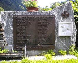 Auf dem Friedhof neben der Kirche befindet sich vor einer niedrigen Mauer aus grobem Stein eine Kriegergedenkstätte bestehend aus einem etwas schief stehenden, stark verwitterten Holzkreuz, dem der offensichtlich früher vorhanden gewesene Corpus Christi abhanden gekommen ist, davor auf einem grob behauenen Stein eine Metalltafel mit den Opfern des 2. Weltkriegs, darunter eine zweite kleinere Metalltafel mit Inschrift. Rechts neben den beiden Tafeln ein Kreuz aus Metall und das Relief eines Soldatenkopfes mit Helm aus weißem Marmor.