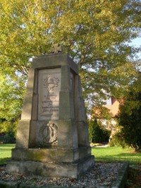 Denkmal für die Gefallenen des 1. und 2. Weltkriegs, abgestufter Sandsteinblock, gekrönt von einem Eisernen Kreuz; Gedenktafeln in der Kirche; Soldatengräber