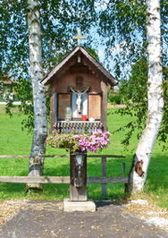 Bildstock am Dorfplatz mit geschnitzten Namenstafeln beiderseits eines Kruzifix..