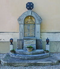 Wandplaketten auf dreistufigen Sockel mit Christusrelief gekrönt mit Eisernem Kreuz aus