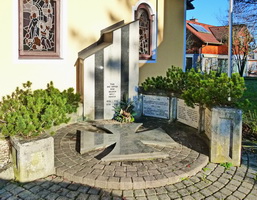 Blumentröge mit drei Namenstafeln neben der Kirche.