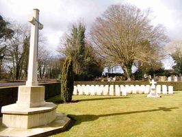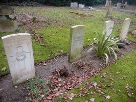 Gemeindefriedhofs. Es liegt zwischen zwei neuseeländischen Soldaten und einem britischen Angehörigen der