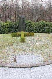 aus Koniferen und einem steinernem Mahnmal in Form von drei Kreuzen