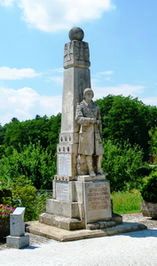Stele gekrönt mit Kugel davor Soldatenstatue. An der Stele sind auch