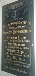 Der im Weltkriege 1914-18 gefallenen Söhne der Gemeinde Lindstedterhorst (Namen) Ehre ihrem Andenken