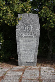 Vor dem Friedhof: stehender Stein mit Inschrift; zusätzlich Hinweise zu Soldaten von privaten Gedenksteinen