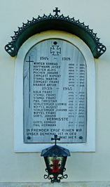 Überdachte Wandplakette an der Außenwand der Dorfkapelle.