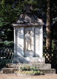 1. Weltkrieg: Dreigeteiltes Denkmal. Links und rechts jeweils die Namen der Gefallenen, in der Mitte ein aufrechtstehender trauernder Soldat mit Tornister. Oben ein eisernes Kreuz. 2. Weltkrieg: Einfacher grob behauener Felsblock mit Namenstafel.