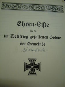 1914–1918 Mit Gott für König und Vaterland zogen in den Kampf für Deutschlands Freiheit und starben den Heldentod (Namen) Ihren gefallenen Söhnen widmet dieses Ehrenmal zum bleibenden Gedächtnis, die dankbare Gemeinde Natterheide. Niemand hat grössere Liebe denn die, dass er sein Leben lässet für seine Freunde.