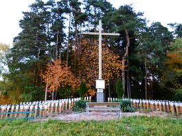 Großes Holzkreuz auf einem Hügel oberhalb des Ortes, davor Holzkreuze mit Metall-Namensschildern.
