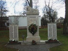 Säule aus hellem Dolomit, gekrönt mit dem liegenden bayrischen Löwen. Vorderfront: Halbrelief Christus am Kreuz, links flankiert von Soldatengestalt, rechts von Mutter mit Kleinkind, dazu Inschrift. Die rechte und linke Säulenflanke zeigen die Daten der Gefallenen des 1. Weltkriegs. Für die Gefallenen des 2. Weltkriegs wurde später rechts und links gesondert jeweils eine schlichte Sandsteintafel aus identischem Juragestein in Mannshöhe hinzugebaut. Darauf die Daten der Gefallenen, darüber die Zahlen 1939-1945. Jede Säule trägt ein kleines Metallkreuz.