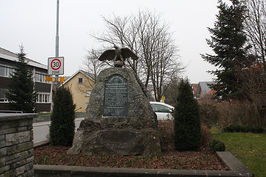 Beim Rathaus: Naturstein, vorne eingelegte Gedenkplatte, oben mit Adler