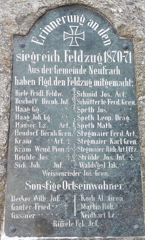 siegreich. Feldzug 1870-71 Aus der Gemeinde Neufrach haben flgd. den Feldzug mitgemacht: (Namen)