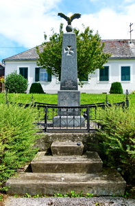 Stele mit Adler gekrönt und mit Metallzaun eingefriedet am Dorfplatz,