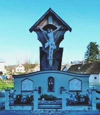 Freistehende Wand gekrönt mit hölzernem Kruzifix eingefriedet mit Ketten am Dorfplatz.