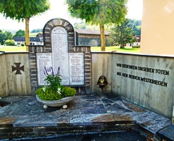 U-förmige Betonwand mit Namenstafeln im Zentrum neben der Dorfkapelle.
