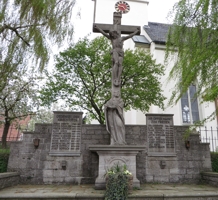 Vor der Kirche steht auf einem Sockel ein großes Kuzifix, welches rechts und links von einer Art Mauer flankiert wird. Die Mauern tragen je eine Tafel mit den Namen.