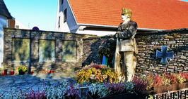 neben der Kirche an denen Namenstafeln aus Metall und ein Eisernes Kreuz befestigt sind. Davor die Statue eines ein Gewehr