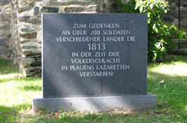 Plauen (Lutherplatz), Vogtlandkreis, SachsenPLZ 08523 Der ehemalige Friedhof am Lutherplatz wurde 1899 als öffentlicher Park umgestaltet. 1953 errichtete die Stadt einen Gedenkstein für 230 Soldaten, die 1813 nach der Völkerschlacht bei Leipzig in den Lazaretten von Plauen starben und hier bestatten wurden.