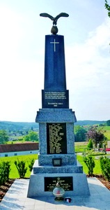 Stele auf Sockel gekrönt mit Adler neben der Kirche.