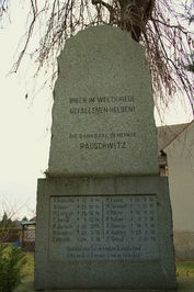 „Ihren im Weltkriege gefallenen Helden! Die dankbare Gemeinde Rauschwitz.“ (Namen) „Und wer den Tod im heilgen Kampfe fand, Ruht auch in fremder Erde im Vaterland.“