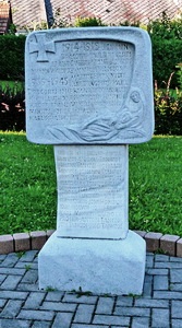 Pilzförmiges Denkmal aus Stein neben der Kirche.