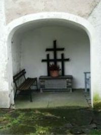 Außenseite der ev.-luth. Kirche mit kleinem Altar mit Inschrift.