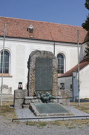 Bei der Stadtpfarrkirche St. Stephan; Denkmal aus Steinen, vorne Gedenktafel (1. Wltkrieg), darunter Lorbeerkranz, davor am Boden schräg angestellte Tafel (2. Weltkrieg); zusätzlich Hinweise zu Soldaten von privaten Gedenksteinen