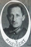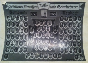 Ehrentafel aus Pappe (ungefähr 28 x 38 cm) mit Bildern der Gefallenen, Vermißten und Heimkehrer. Darauf viele