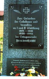 Tafel auf deutsch: Zum Gedenken der Gefallenen und Vermißten im I. und II. Weltkrieg 1914 – 1918 1939 – 1945 der Ortsgemeinde Roschowitzwald