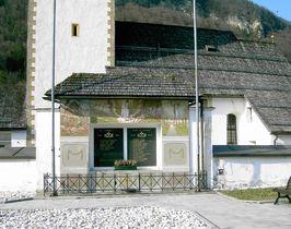 Überdachter Mauerteil außen an der Friedhofsmauer mit zwei eingelassenen Natursteintafeln mit den Namen der Gefallenen umrahmt von Bildern.