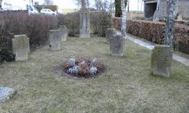 auf beiden Seiten insgesamt sechs Gedenksteine in Kreuzform.