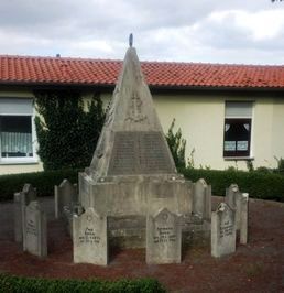 Pyramidenartig gestaltetes Denkmal für die Gefallenen des 2. Weltkrieges mit ihren Namen. Davor auf