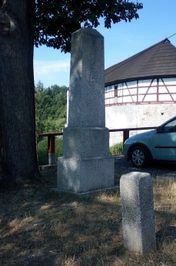Grauer Steinobelisk am Parkplatz vor der Burg Seeberg. Die Inschriften sind nicht mehr lesbar. Die Namen wurden dem Buch "Heimatkreis Eger. Geschichte einer deutschen Landschaft in Dokumentationen und Erinnerungen. Herausgeber: Egerer Landtag e.V., Amberg in der Oberpfalz, 1981, Seite 469" entnommen