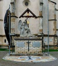 eines liegenden, eines neben ihm knieenden Soldaten und eines stehenden Engels. An den Seitenwänden Metall-Namenstafeln