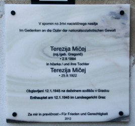 V spomin na žrtvi nacisticnega nasilja Im Gedenken an die Opfer der nationalsozialistischen Gewalt Terezija Micej (roj. / geb. Gregoric) * 2.9.1884 in hcerka / und ihre Tochter Terezija Micej * 25.9.1922 Obglavljeni 12.1.1945 na deželnem sodišcu v Gradcu Enthauptet am 12.1.1945 im Landgericht Graz Za mir in pravicnost . Für Frieden und Gerechtigkeit 2012